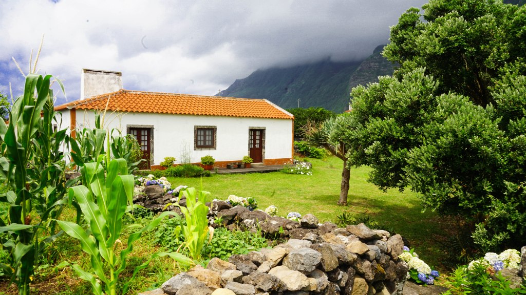This charming house can only be reached by a short footpath, ensuring peace and privacy. It sits surrounded by its own garden and neighbouring fields, with wonderful views of the countryside stretching up to the dramatic cliffs beneath which Fajã Grande nestles. You can see the orange glows of sunset, tumbling mist over the cliffs, wild waves and winds and blistering sunshine all in one day from grounds of the house.
