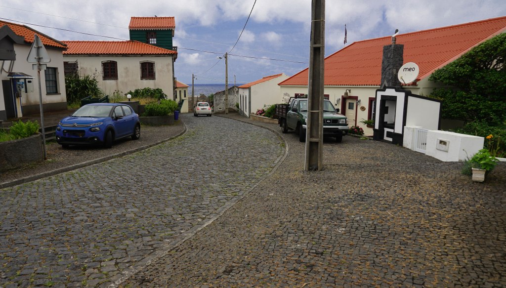 Once you arrive in Fajã Grande, you will drive through the centre of the village. You will pass Costa Restaurante on the right-hand side, and a right turning, after which the road become known as Rua Via d’Agua. You can park your car on the widened verges either side on the road just beyond this point. This area is shown below (parking best where the blue car is in the below):