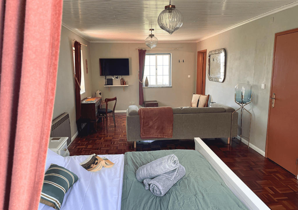 Upstairs, the main house has 2 suites, each with open plan bedroom and lounge with balcony, king size beds (EU) and a private bathroom.